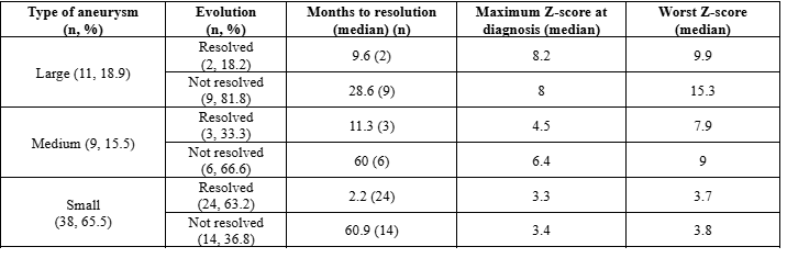 Descriptive study including 696 patients with KD registered in the Spanish KAWA-RACE registry (prospective cohort, 2018-2025). Coronary artery aneurysms were analyzed and classified according to standard criteria (McCrindle, 2017). The rate of complete resolution and the time to resolution of coronary aneurysms were assessed. The association between the severity of coronary involvement—defined by the worst coronary z-score and the maximum z-score reached at diagnosis—and time to aneurysm resolution was evaluated using Spearman’s correlation coefficient.