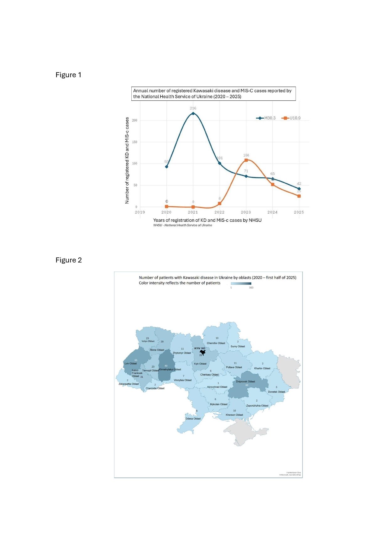 Results. The literature review identified approximately 50 documented pediatric KD cases over three decades, including two acute-phase fatalities and a single-center series of 23 cases from Kyiv (2016–2017; incidence 4.6). Publication activity increased over time from rare early reports to near-annual and, more recently, multiple publications per year. NHSU data for 2020–H1 2025 captured 588 KD cases and 194 MIS-C cases (fig. 1). Because the MIS-C code entered routine use only from 2022, diagnostic and coding overlap with KD during the COVID-19 period is likely. Marked regional heterogeneity was observed, with higher detection in major referral regions (Fig. 2). In Kyiv, the minimal KD incidence in 2024 reached 11 per 100,000 children under five.
