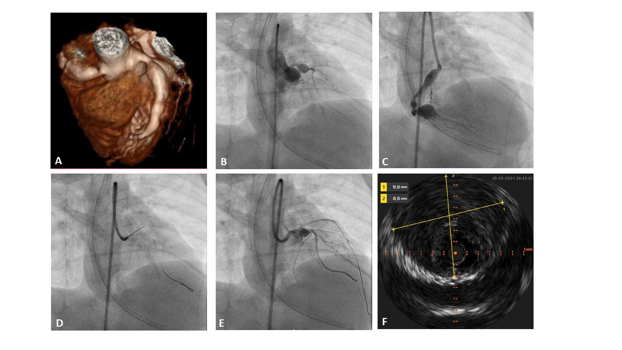 Introduction – 9-month-old infant (9 kg) with a history of a delayed diagnosis of Kawasaki disease with major coronary artery aneurysms of the left and right coronary artery (Figure A-C), was admitted to the PICU for systemic fibrinolysis. This was due to a large thrombus in the aneurysm of the proximal LAD, despite being on triple anticoagulation therapy (ASA, clopidogrel, low-molecular weight heparin). The initial systemic treatment was largely successful in resolving the thrombus. However, after two weeks, signs of acute ischemia emerged (ECG changes and elevated cardiac enzymes). Echocardiography and CT-A suggested a possible complete occlusion of the LAD.