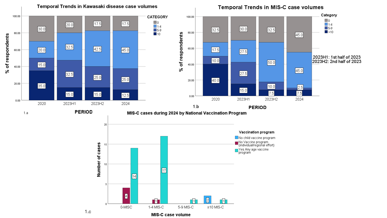 We distributed a cross-sectional, online survey using MICROSOFT Forms to the KAWARABI investigators. Respondents reported aggregated data on encountered MIS-C and KD cases as categorical estimates (0, 1–4, 5–9, or ≥10 cases) during predefined time periods (2020, first and second halves of 2023 (2023H1 and 2023H2), and 2024). The survey also assessed the presence of national SARS-CoV-2 vaccination programs. Data was described as proportions and percentages.